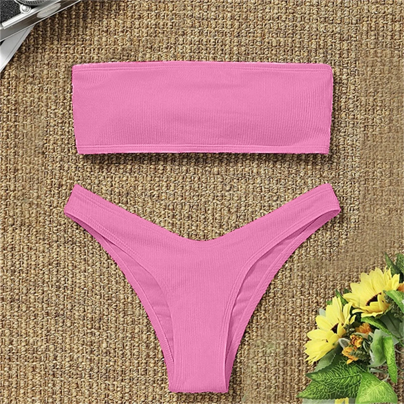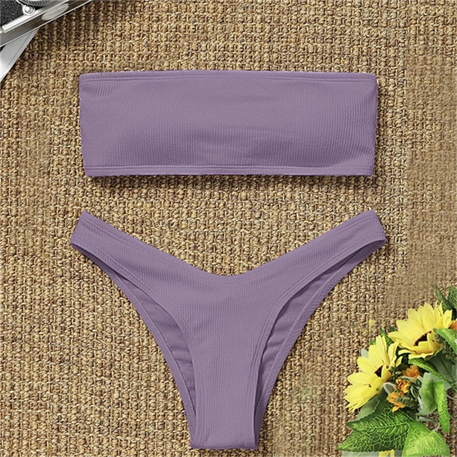 Maillot de bain deux pièces sexy uni, collection 2026, haut sans bretelles et short assorti, idéal pour l'été tropical.