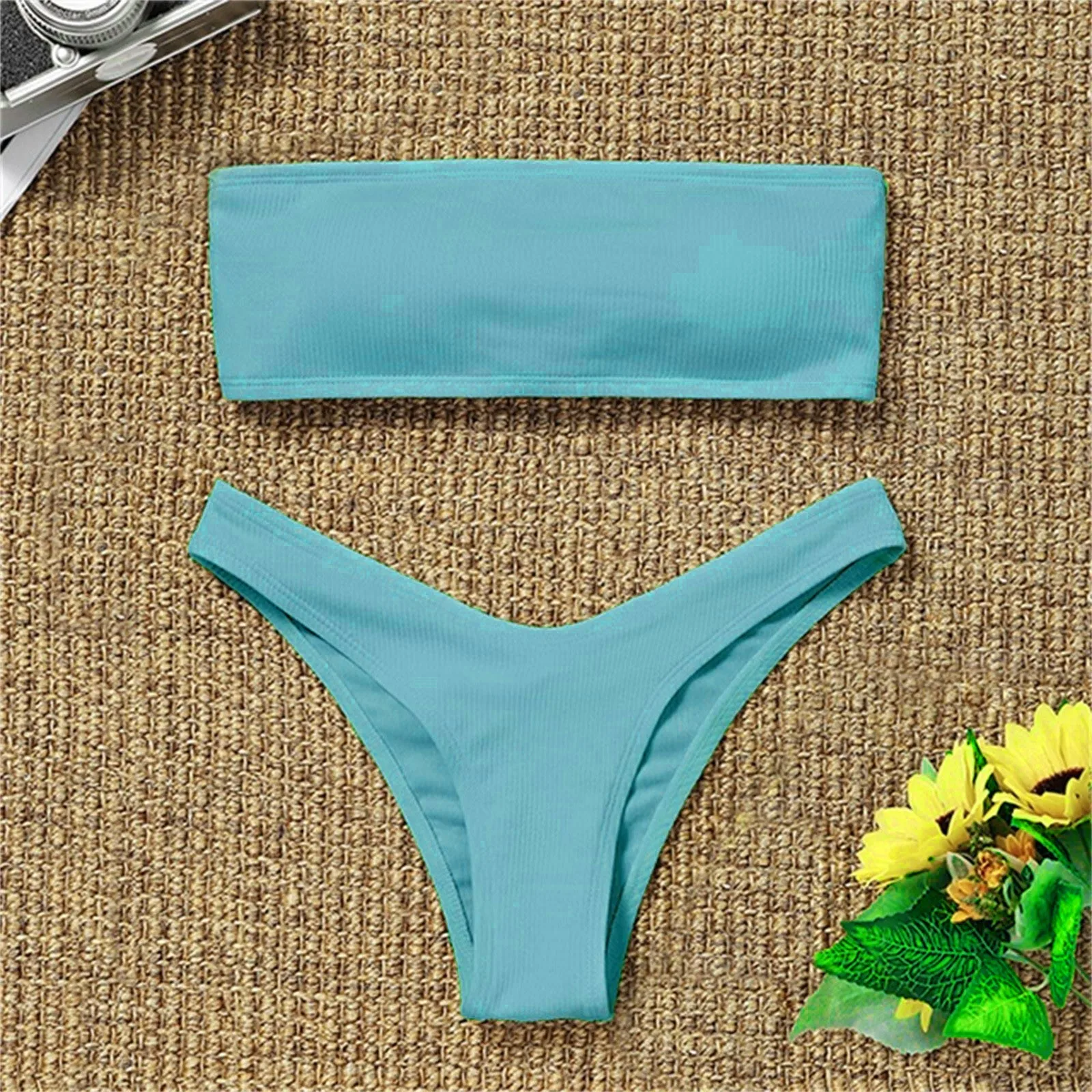Maillot de bain deux pièces sexy uni, collection 2026, haut sans bretelles et short assorti, idéal pour l’été tropical.