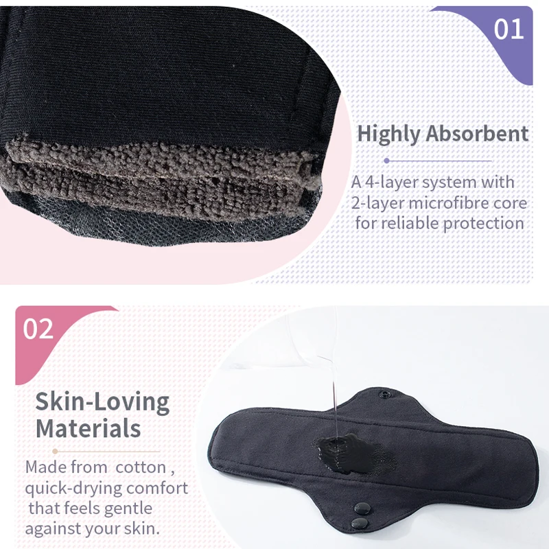 Lot de 6 serviettes hygiéniques lavables, anti-fuites et respirantes pour femmes, idéales pour la récupération post-partum, l'usage quotidien et les voyages. Écologiques et respectueuses de l'environnement.