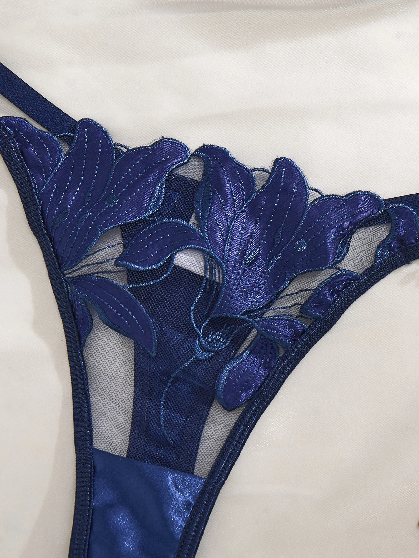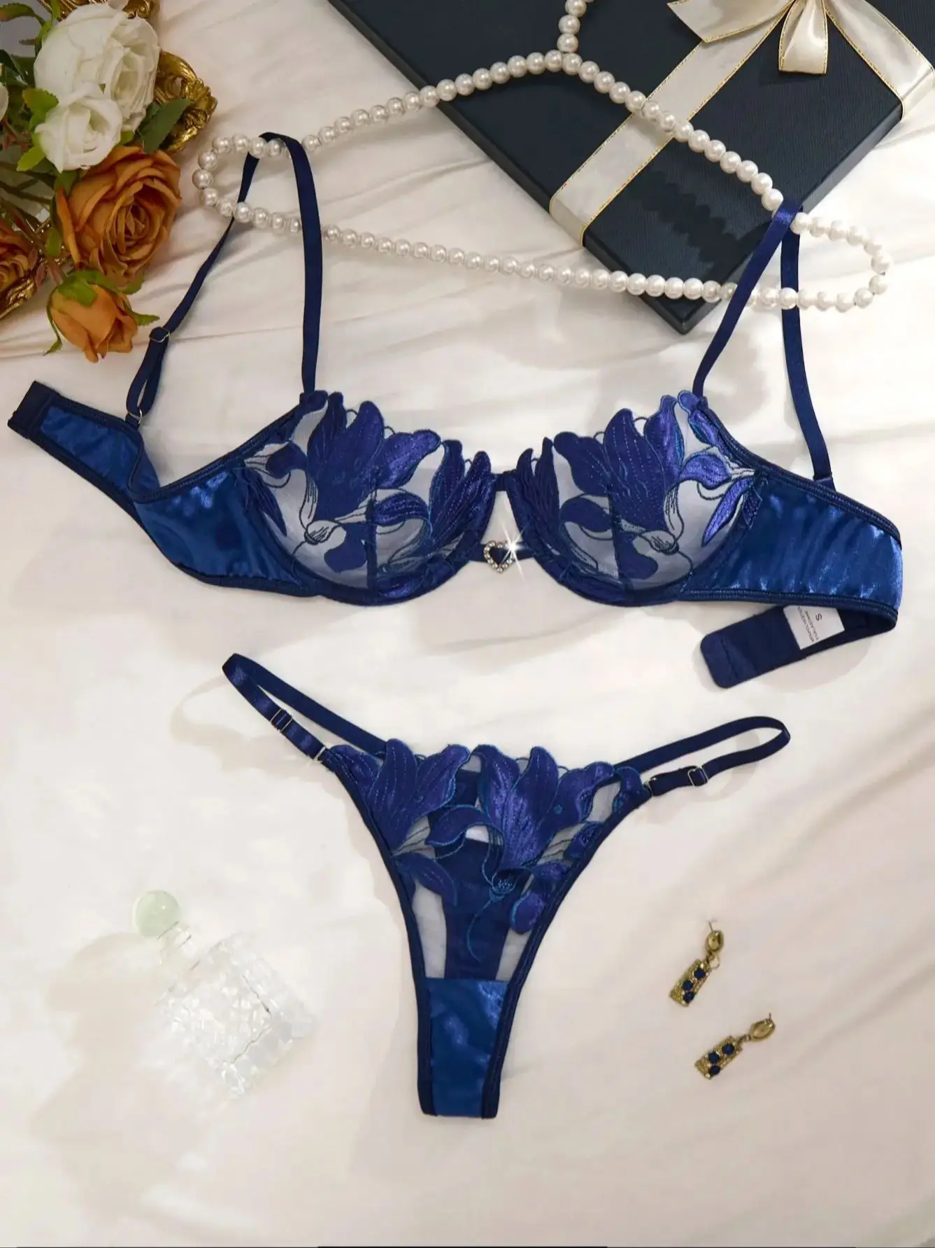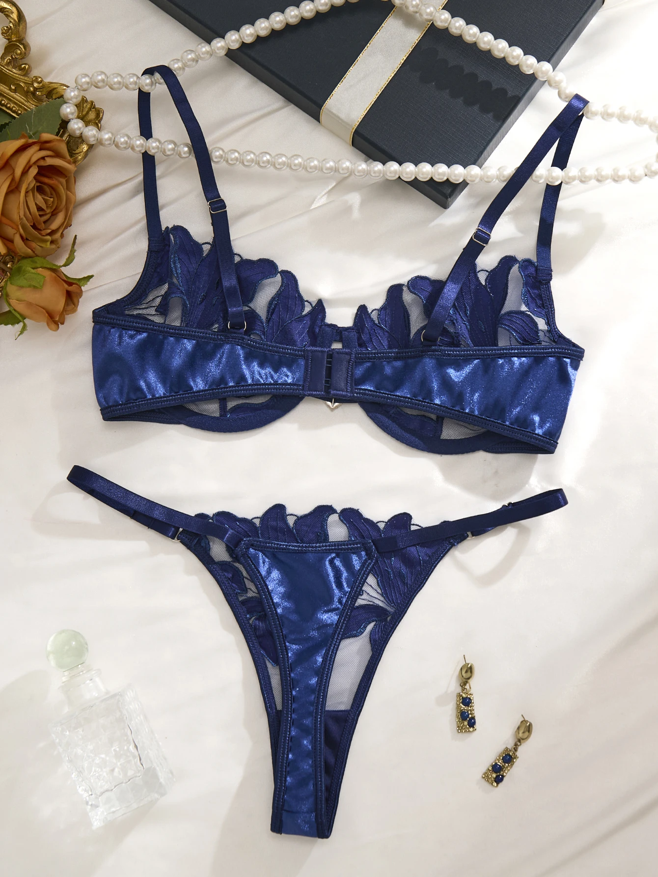Ensemble de lingerie en dentelle brodée de fleurs bleues, style français, soutien-gorge à bonnets en acier souples et sexy, idéal pour la Saint-Valentin (ZA824031).