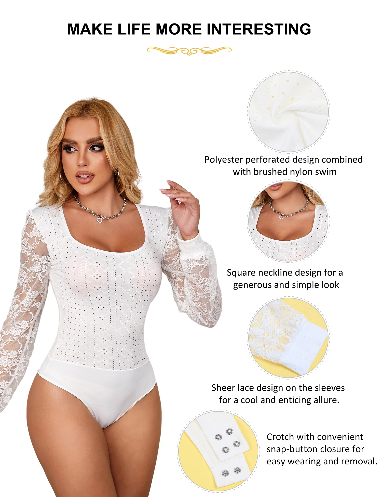Combinaison sexy blanche à manches longues avec entrejambe ouverte en dentelle et résille, grand col carré, vêtements élégants pour femme