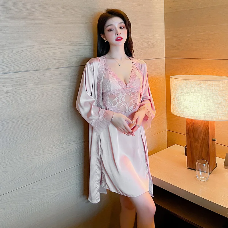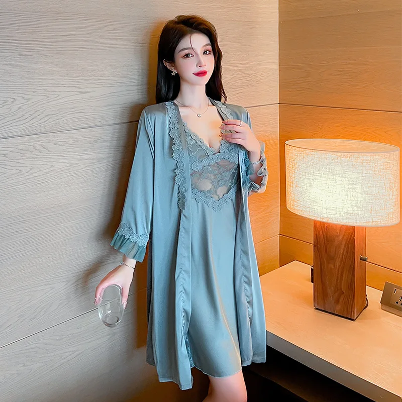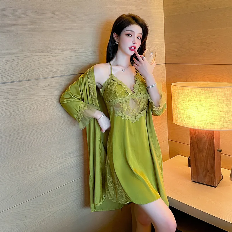 Lingerie de mariée, ensemble de lingerie de détente en dentelle, robe de chambre 2 pièces à col en V avec bretelles, nuisette kimono sexy, peignoir, mini-robe de nuit