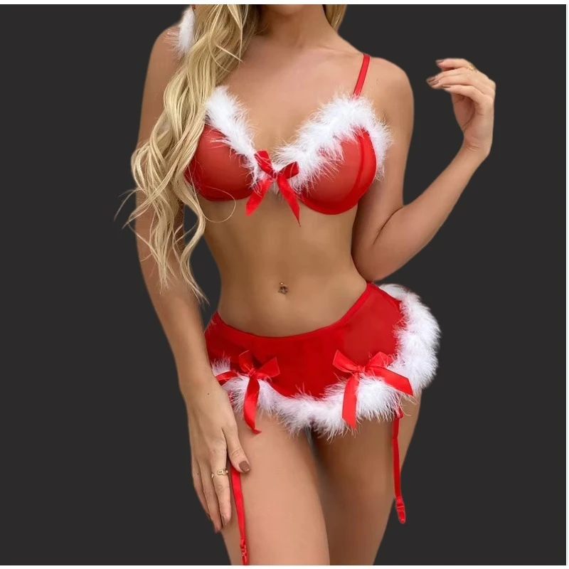 Ensembles de lingerie de Noël pour femmes, costumes érotiques pour jeux de rôle, soutien-gorge, culotte et jarretières en dentelle rouge sexy à bretelles et nœud papillon.