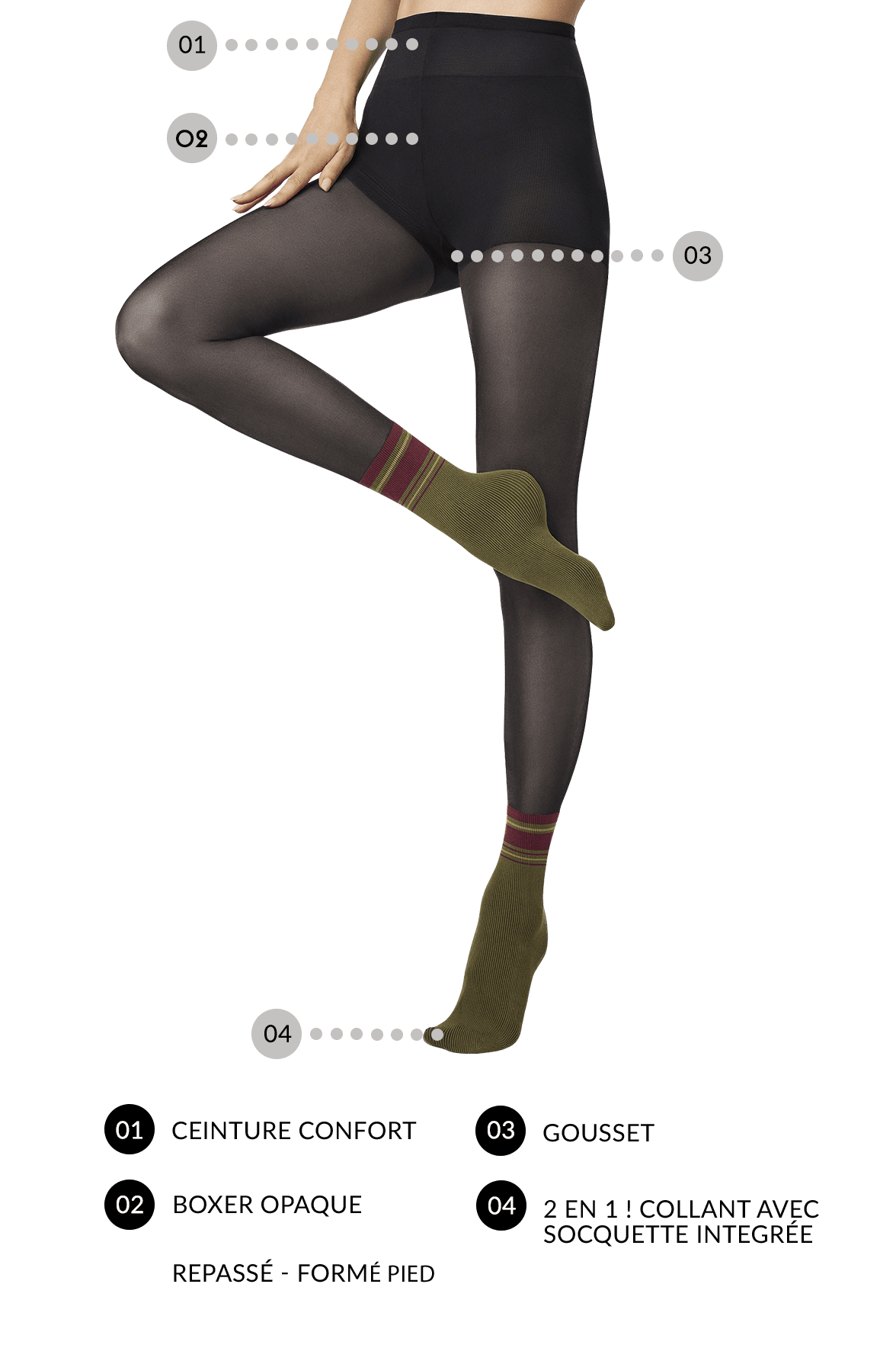 Grâce à son innovation, ce collant avec socquette intégrée assure une finition impeccable et discrète. Les socquettes ajoutent une touche pratique à ce modèle sophistiqué, parfait pour toutes les occasions, qu’il s’agisse d’une réunion professionnelle ou d’une sortie décontractée.