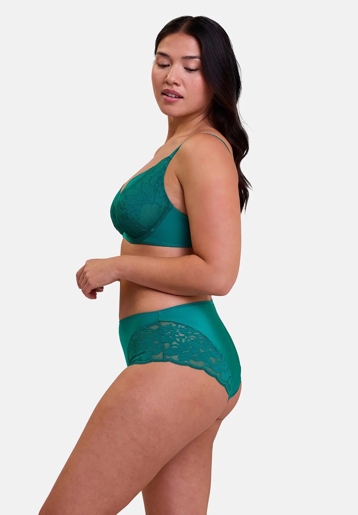 Associez la Culotte Romance Vert Emeraude avec le soutien-gorge assorti pour compléter votre ensemble. Cet accord parfait entre élégance et confort vous assure une allure raffinée et séduisante inégalée, parfait pour toutes les occasions.