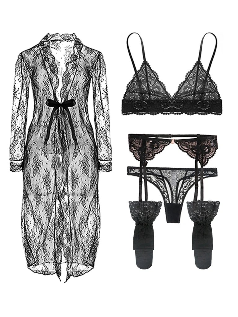 Description courte : Ensemble lingerie 3 pièces en tulle brodé et maille transparente, finition dentelle, rendu délicat et audacieux.