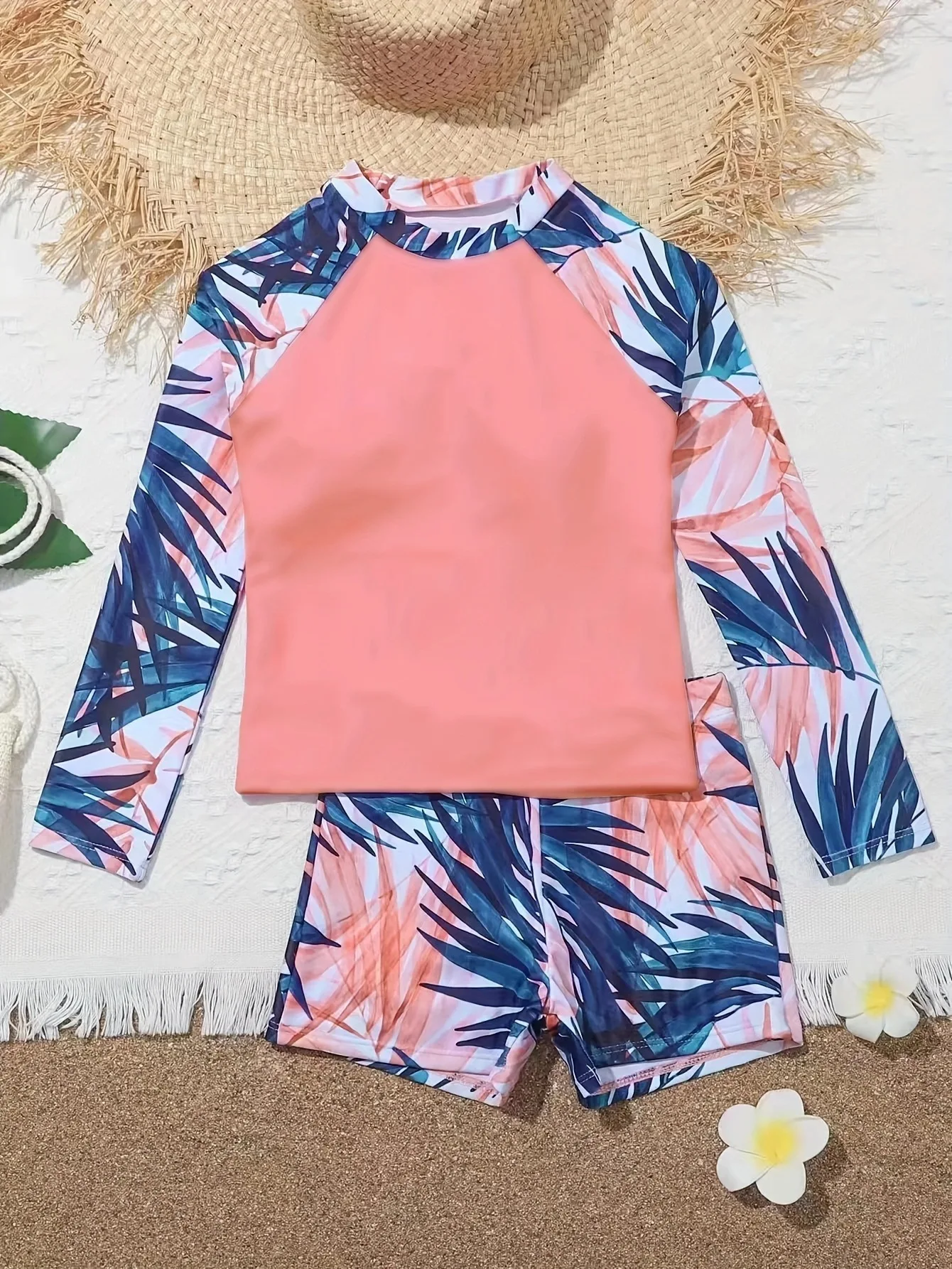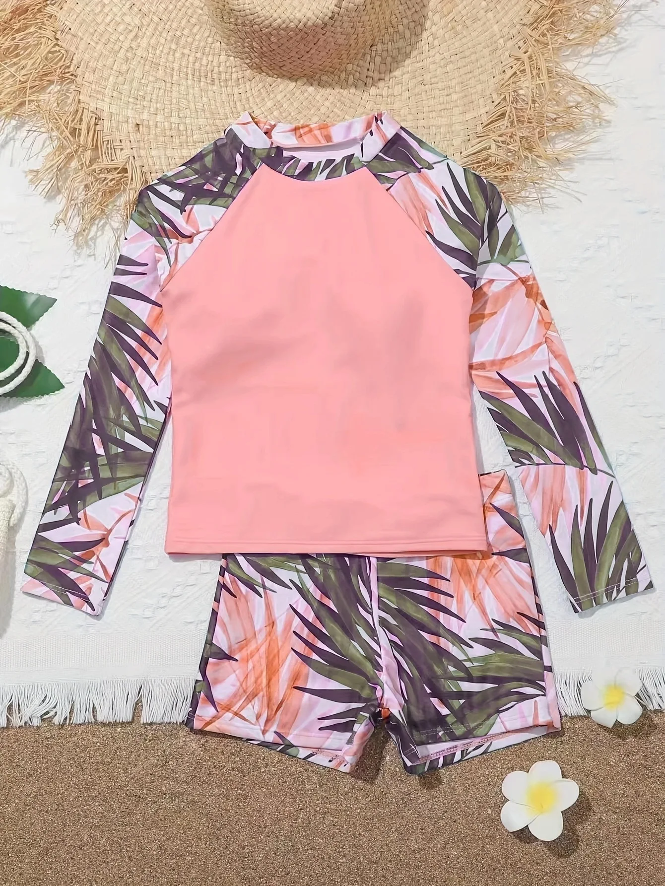 Maillot de bain fille 2024, nouveau modèle rose imprimé à manches longues, maillot de bain d’été pour enfants, short de bain pour filles