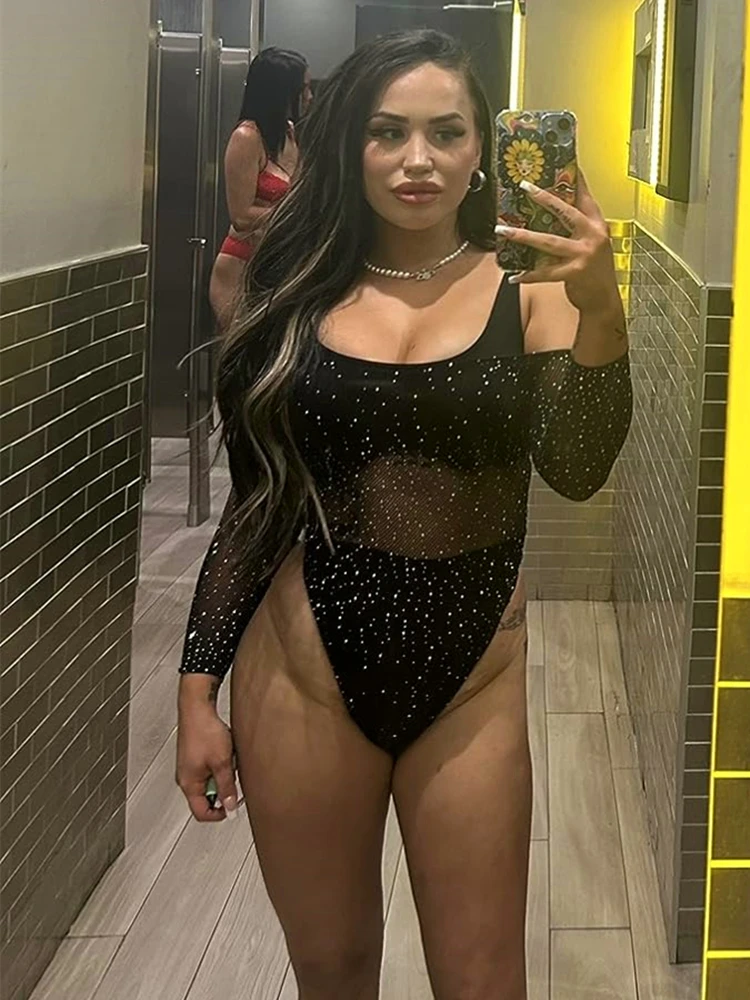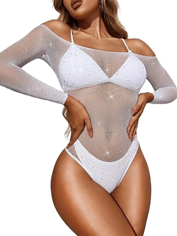 Body en dentelle pour femme, body skinny sexy et basique, top ajouré, body résille à manches longues, lingerie à strass.