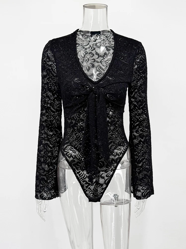 Combinaison sexy en dentelle à manches longues, col en V lacé, empiècement torsadé, transparente, idéale pour les soirées d'été (collection 2026)