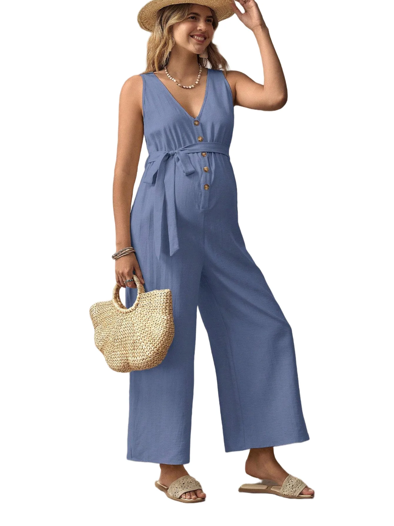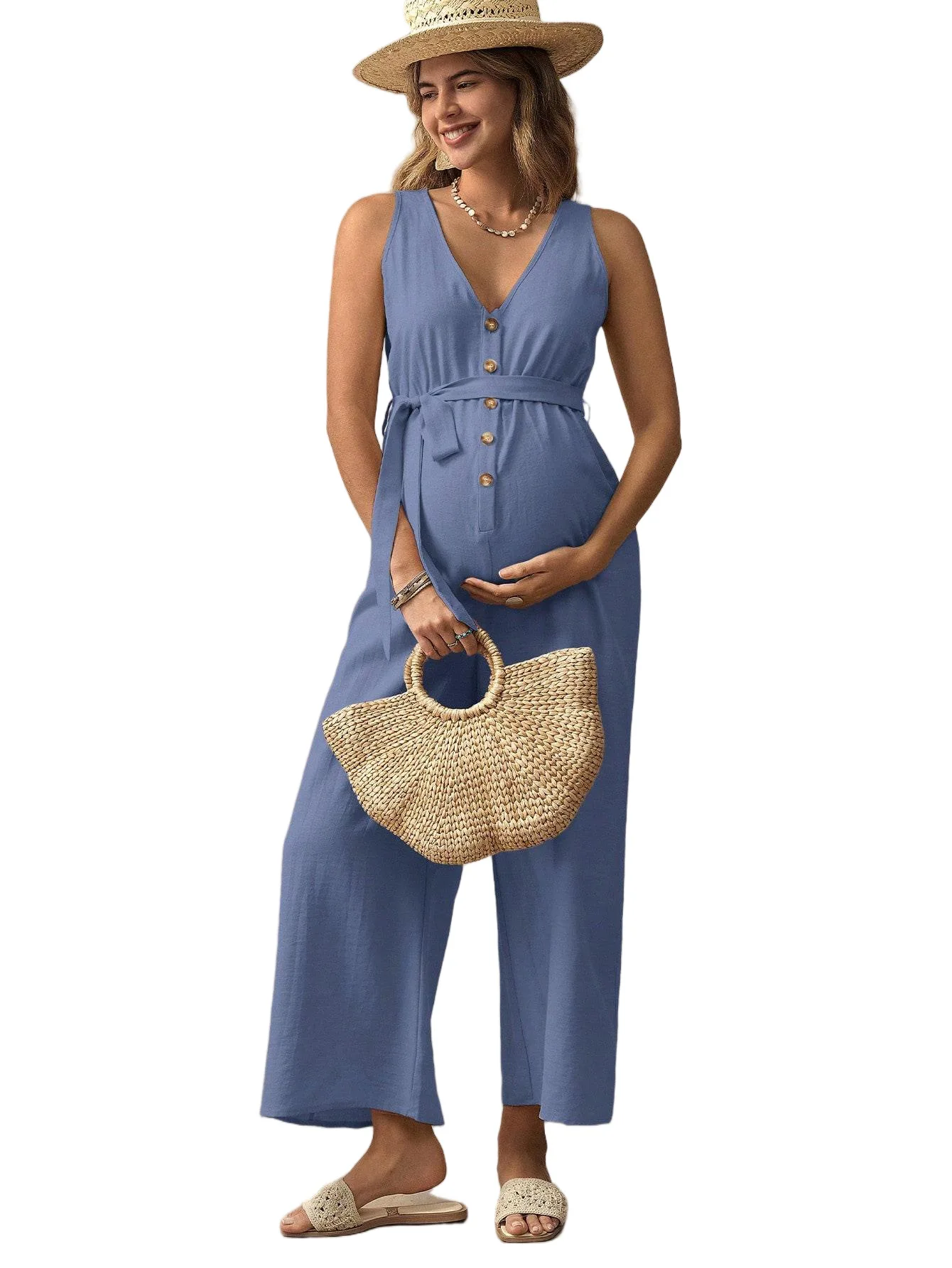 2: Combinaison longue ample sans manches à col en V pour femmes enceintes, tenue décontractée de grossesse