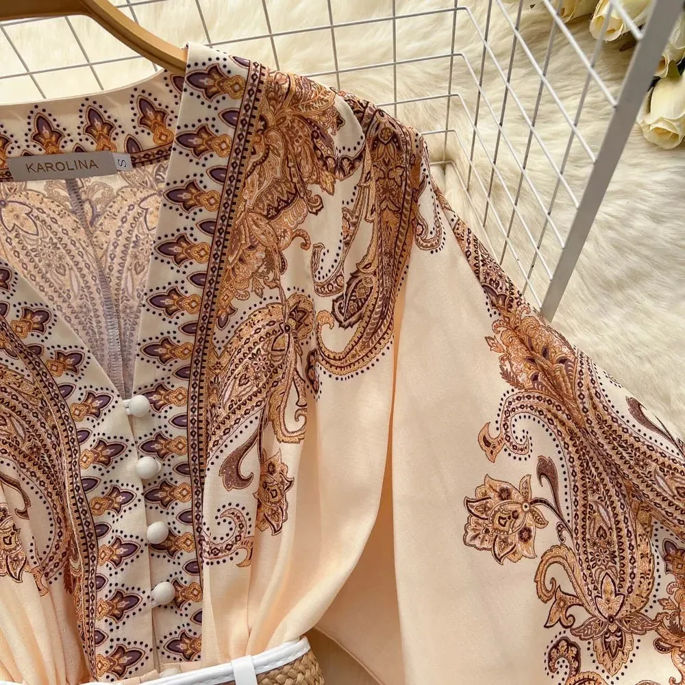 Robe élégante vintage à imprimé, col en V, manches longues, coupe trapèze, style lanterne, mode femme automne-printemps