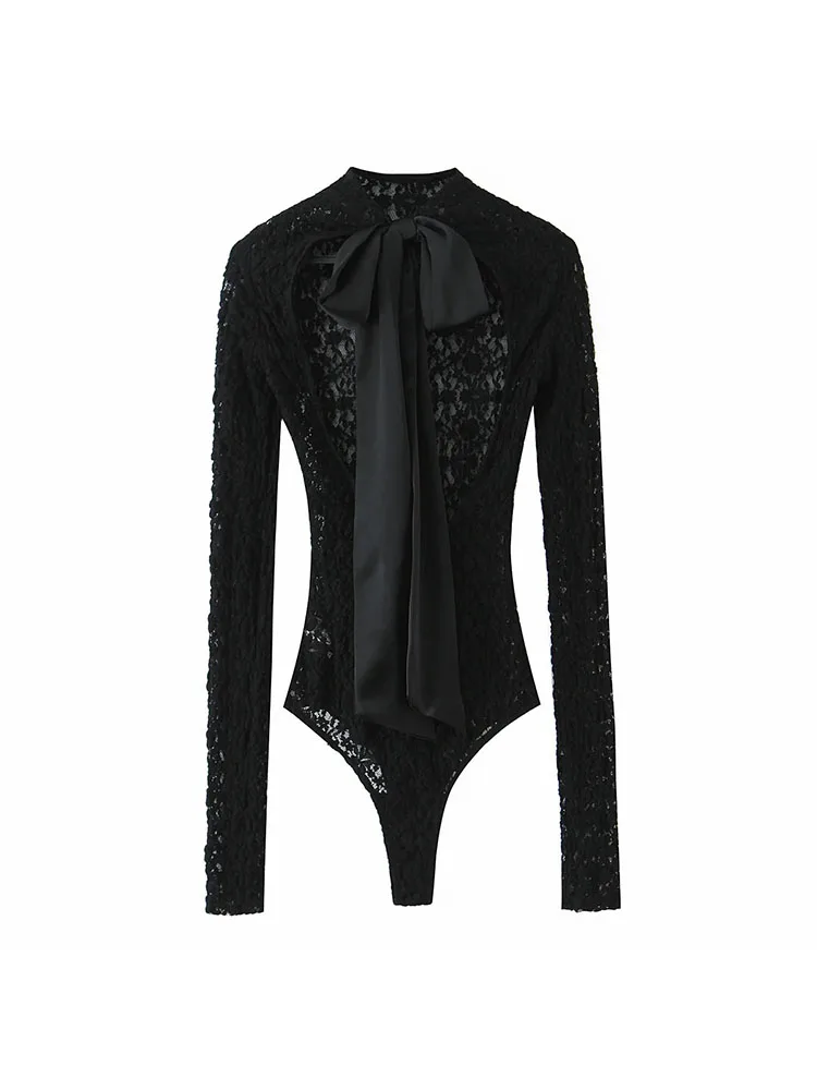 Soyez le premier à laisser votre avis sur “Body en dentelle noir ajouré à col rond et manches longues, collection automne 2025, avec mini-jupe assortie.”