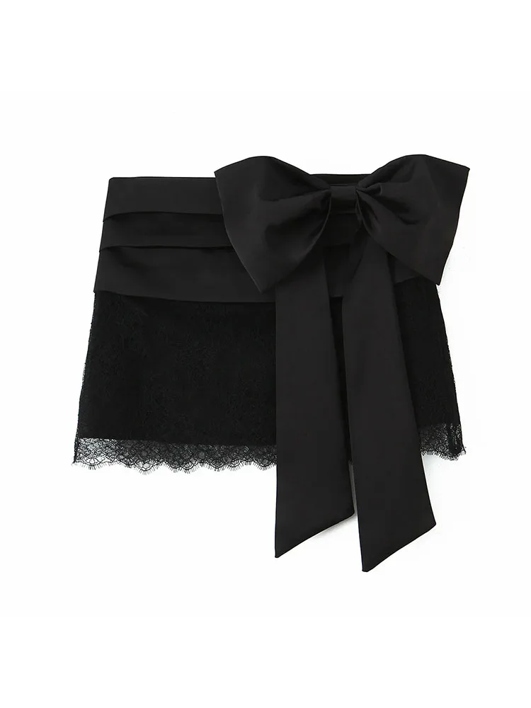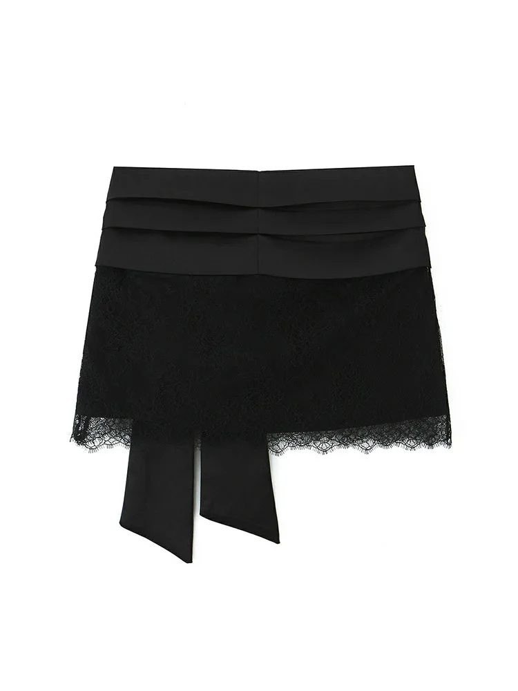Body en dentelle noir ajouré à col rond et manches longues, collection automne 2025, avec mini-jupe assortie.
